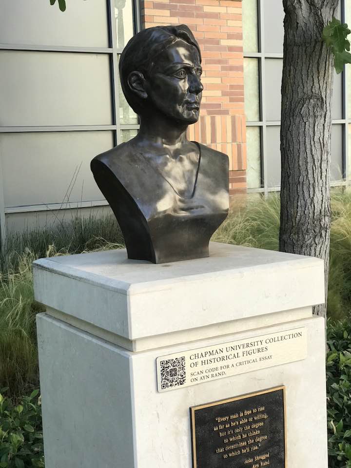 נתקלתי בה בדרך לארוחת הבוקר. אוי לא! אוניברסיטת צ'אפמן הציבה בשדרת הקמפוס שורת פסלי דמויות "מעוררות השראה," וביניהן אחת הנשים המתועבות בתולדות המחשבה האמריקאית.