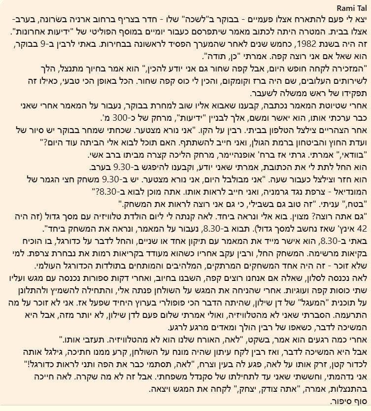 רק פעם אחת ראיתי אותו מקרוב. לא זיכה אותי במבט, למרות שאני הייתי קודם מרכז הערב. הרצאה בחוג בית. משלמים יפה והכיבוד זה ארוחת ערב בפני עצמה. צריך רק לחפש בארון חולצה נורמלית ולהעביר מספריים על הראש. זה היה באופנהיימר, אז הוא ואשתו הלכו בוודאי ברגל מרב אשי ליד הבית של יקיר. פרס גר בבלוק הסמוך אבל לא בא, היה אז ברוטציה לצד שמיר, לפני או אחרי מי זוכר. ברור שהשניים האלה לא ייראו באותו מקום אם זו לא חובה.