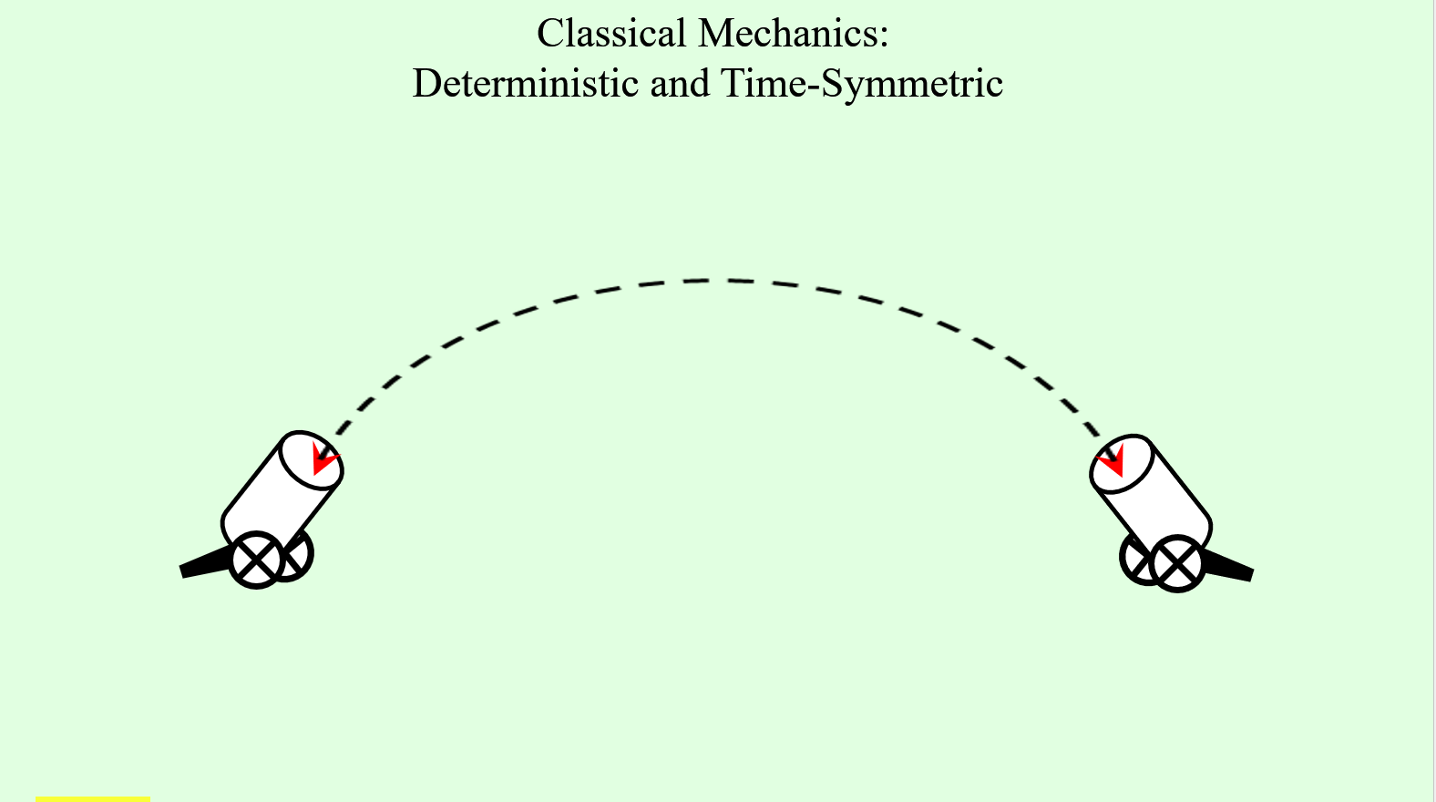 עוד מאפיין של הפיזיקה הקלאסית הוא שנוכל לחשב את מסלולו של קליע זה אחורנית, מהסוף להתחלה: נכניס לחישוב את המיקום, הכיוון והמהירות של פגיעת הקליע במטרה ונשאל מה מקום ירייתו בעבר. או, פשוט יותר: נשגר אותו חזרה, בדיוק באותה מהירות וזווית. בשני המקרים, הן בחישוב העיוני והן בניסוי המעשי, ישוב הקליע בדיוק אל לוע התותח ממנו נפלט.