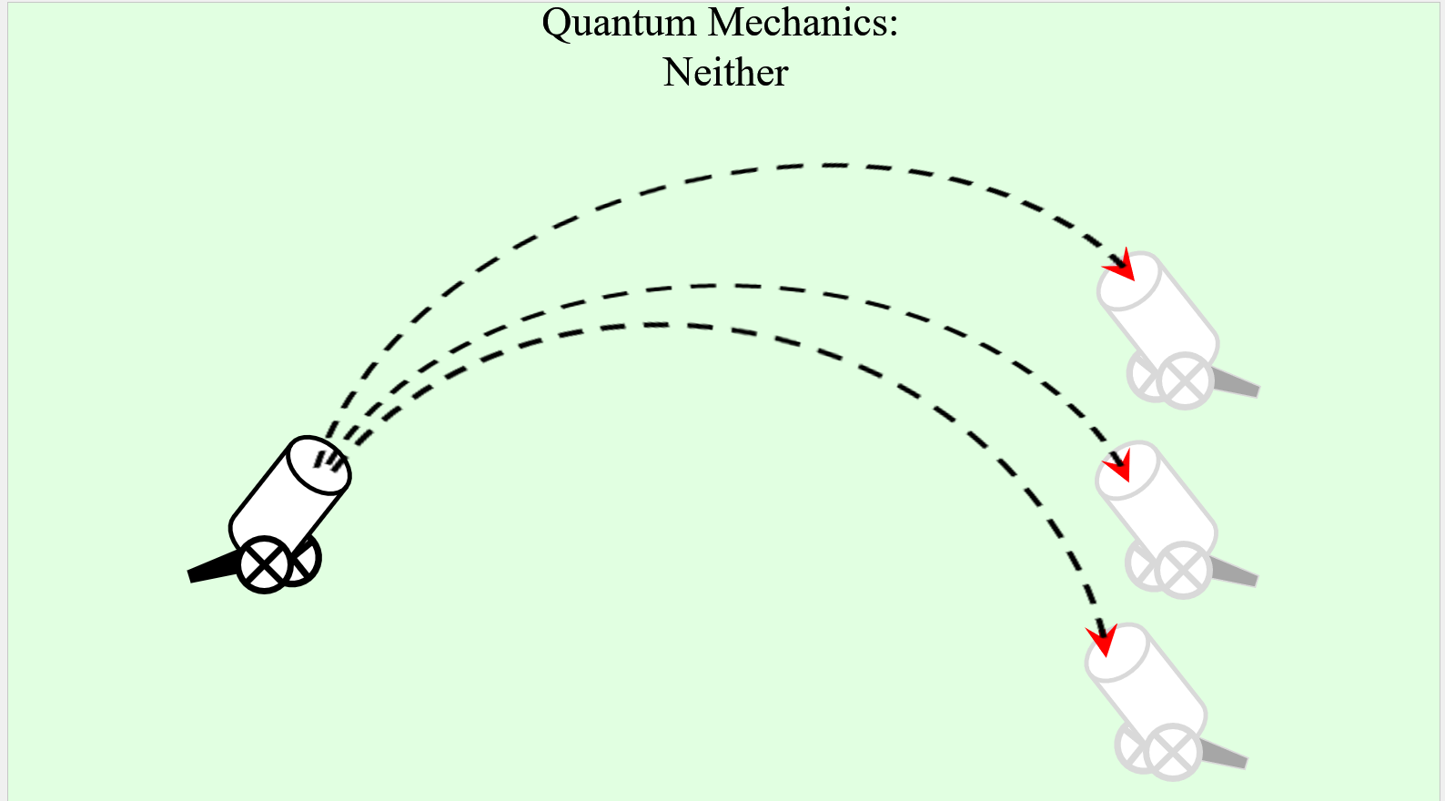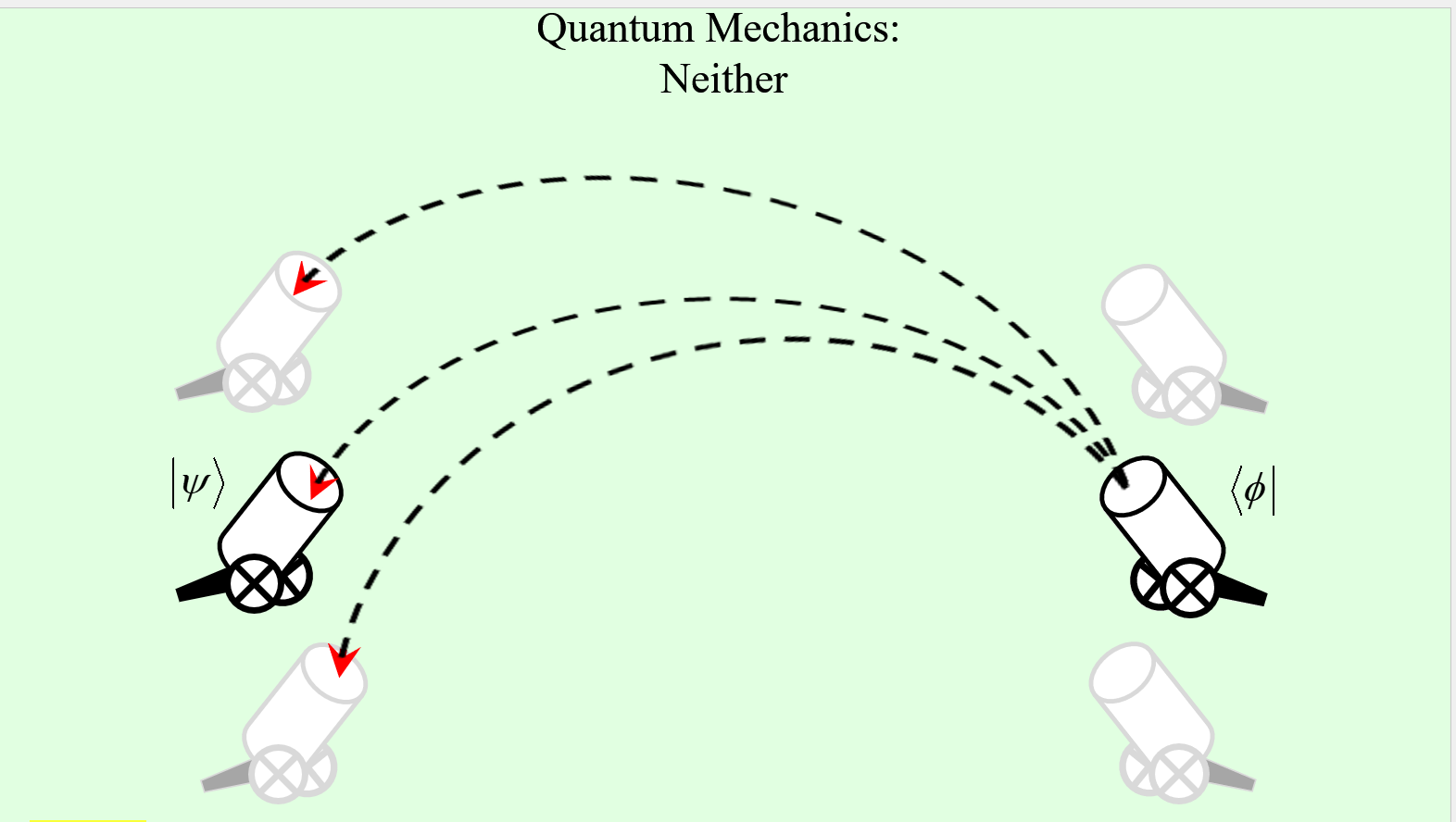 נחליף אם כן את קליע התותח בחלקיק, ונציב בחישוב את המיקום, הזווית והמהירות בה שוגר. הפעם נקבל לא מסלול אחד, אלא אינספור מסלולים המתפזרים לכל הכיוונים. לכל מסלול ולכל נקודה בסופו קיימת הסתברות כלשהי שהחלקיק יהיה עליו. יתקבל אם כן גל מתפשט.