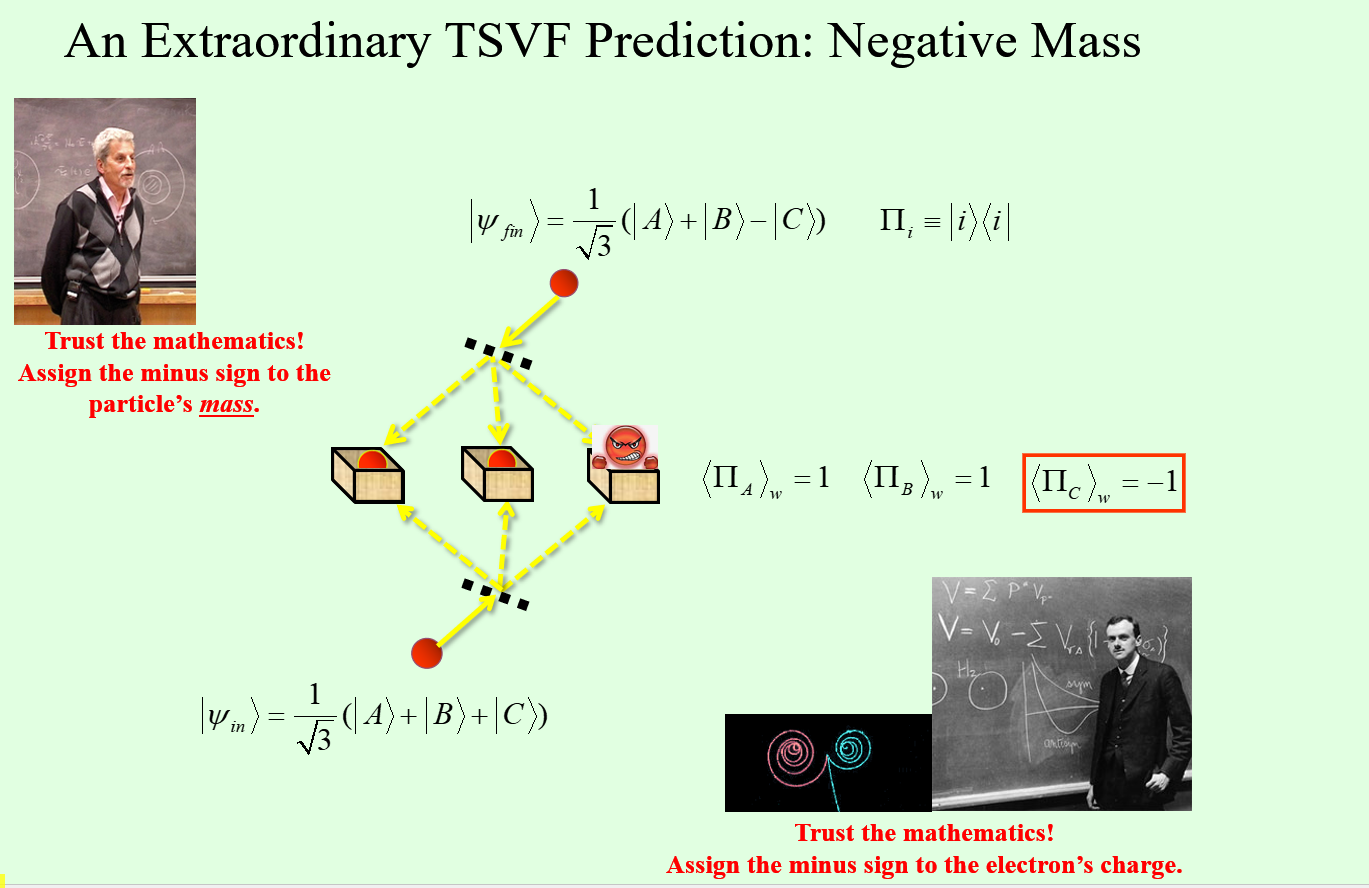 את השיטה הזאת ניצלנו ד"ר אליהו כהן ואני לבדיקת ניבוי אחר ומסעיר מאוד של אהרונוב. נשוב לצמד המדידות הנדירות. בין שתי מדידות כאלה, יכול החלקיק להתפצל לכמה "חלקיקי רפאים" זמניים. חצי מחלקיקי רפאים אלה הם בעלי מאסה חיובית, וחצי-פחות-אחד בעלי מאסה שלילית. בזמן המדידה הם יבטלו אלה את אלה, כך שבסופו של דבר ישוב ויתגלה חלקיק אחד בלבד.