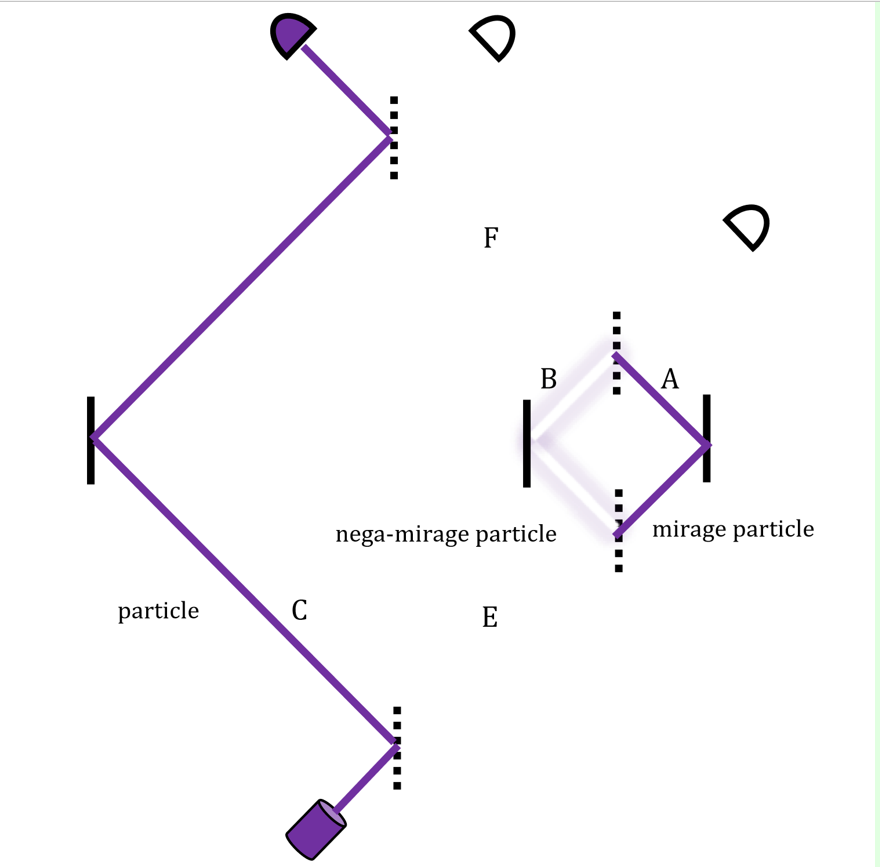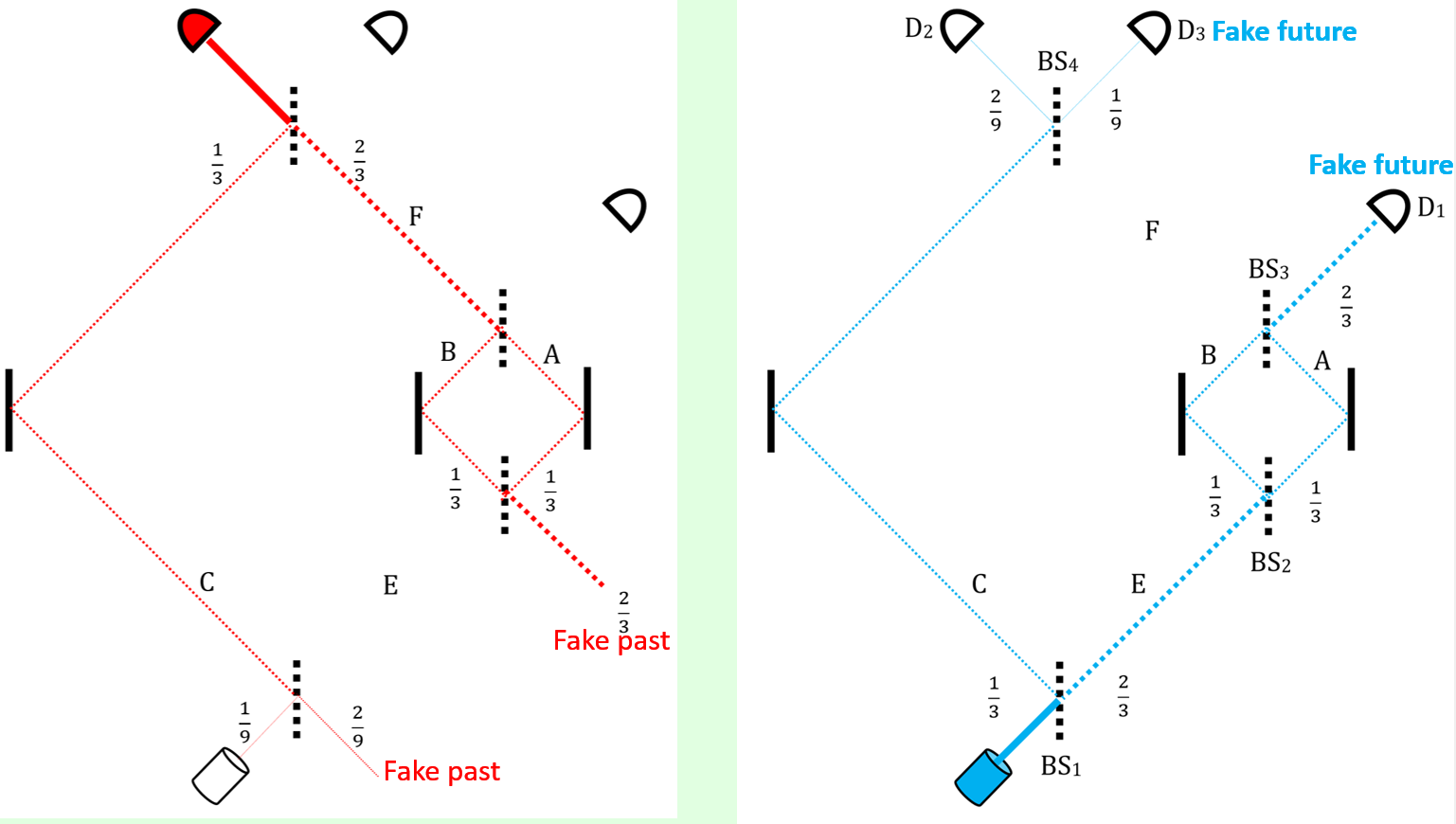 את הדינמיקה הזאת תיארנו, אהרונוב, כהן, ויגל ואני במאמר המופיע כאן. https://www.mdpi.com/1099-4300/20/11/854 . כמי שלקח את תפקיד הסופר אני גאה לציין שהמאמר כתוב בשפה שגם תלמידי תיכון במגמה הומאנית יבינו, ואפילו ייהנו יותר מאלה שעשו חמש יחידות. ראו את הציורים: ההיסטוריה ההולכת מהעבר לעתיד מסומנת בקו כחול, וזו ההולכת אחורנית מהעתיד לעבר היא באדום. ניתן לראות ששתי ההיסטוריות אינן חופפות, וכל אחת נותנת מקטעי פייק מקווקווים בכחול ובאדום. אבל בקטע שבו "עתיד פייק" ו"עבר פייק" חופפים – פרק-זמן קצר ללא עבר וללא עתיד – מופיע קו רציף סגול, המציין שהיה שם חלקיק ממשי!