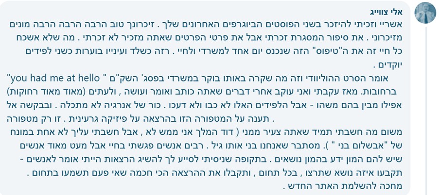 מייל הגיע אליי בוקר אחד מישראל. ד"ר ראובן הילר, ידיד יקר עד היום. אתה יושב? כתב באנגלית, ומיד שמעתי את צחוקו המצלצל מעבר לאוקיאנוס. תשב תשב. הערב נגמרה השביתה בטלוויזיה אחרי כמה חודשים, והקרינו ראיון של רם עברון אתך. גדול! אמרת על האוניברסיטאות שהם חנטריש. גדול! רם עברון ציטט מהספר שניבאת שהפלסטינים הולכים להתקומם [האינתיפאדה הראשונה פרצה בדצמבר]. גדול! ואז הרבצת חיקוי של מה שאמר לך גרשום שולם. גדול!