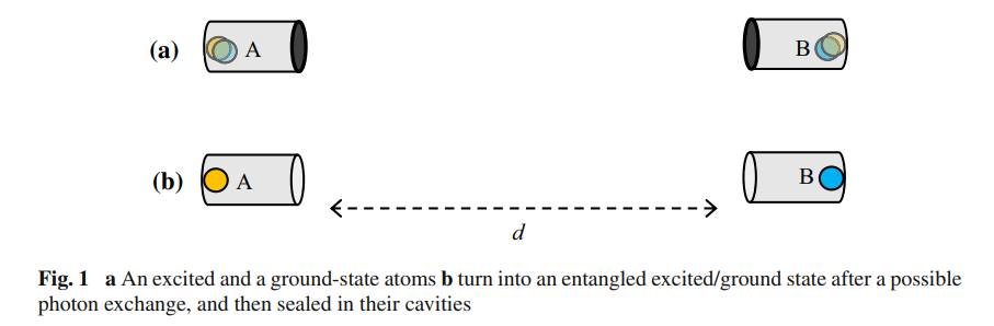עד כאן הכל הגיוני מבחינת הפיזיקה הקלאסית. אבל עקב אי-הוודאות הקוונטית לגבי זמן הפליטה, מתחייב שתוך פרק-זמן מסויים יהיו שני האטומים בסופרפוזיציה: מעוּרָר/רגוע מול רגוע/מעוּרָר. מכאן ברור שהם גם יהיו שזורים: המדידה של אחד מהם תאלץ אותו לבחור באחד משני המצבים, אבל בו-ברגע תחייב את האטום השני לבחור במצב ההפוך.