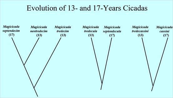 ג. מה היחסים הפילוגנטיים בין שבעת המינים? לכאורה קל: לכל ציקאדות ה-13 אב משותף אחד, ולכל ציקאדות ה-17 אב משותף אחר, נכון? אז לא: יש כאן שלושה אבות קדמונים, שמכל אחד מהם התפצלו שניים או שלושה מינים עם שני המחזורים לעיל.